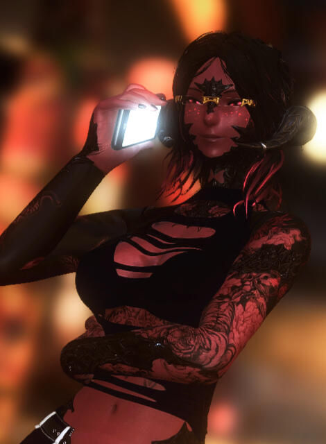 notable features. Tattoos covering her arms, midrif and thigh.